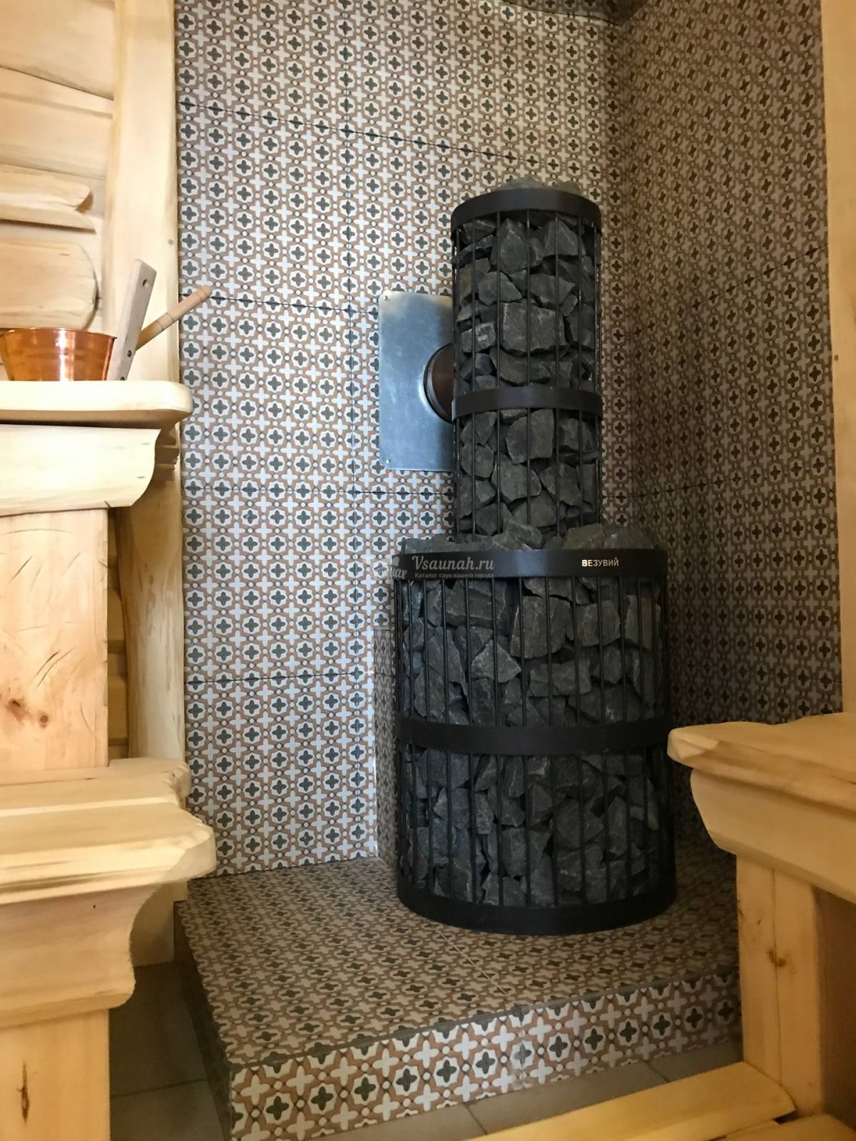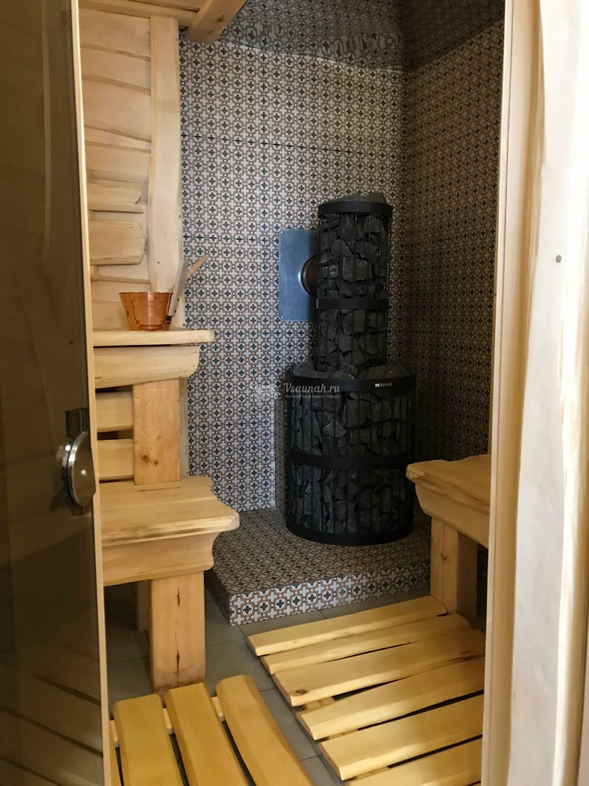 Правильный пар обеспечивает печь-камин премиум-класса. Позволяет любоваться игрой огня, топится исключительно березовыми дровами. Облицована печь камнем змеевиком, а это значит, что не будет вредного инфракрасного излучения, не будет теплового удара.